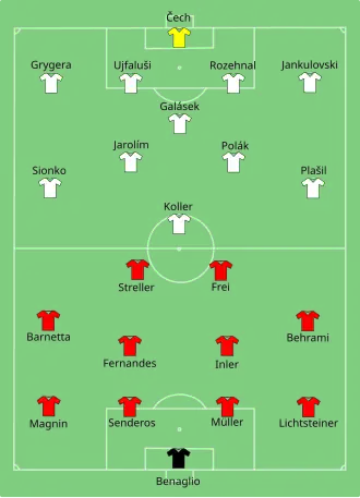 - 7 juin : la Suisse fait preuve de malchance, notamment avec la blessure au genou du meneur de jeu et meilleur buteur Alexander Frei pendant le match. Elle se crée pourtant plus d'occasions que son adversaire[1]. Malgré cela, la sélection tchèque marque un but décisif (71e) par son numéro 10, Václav Svěrkoš, qui venait de remplacer Jan Koller. La sélection helvète a eu d'autres possibilités dans ce match très serré, pour preuve le tir détourné par le poteau. Petr Čech réussit donc à garder ses cages inviolées. Suisse 0, Tchéquie 1.