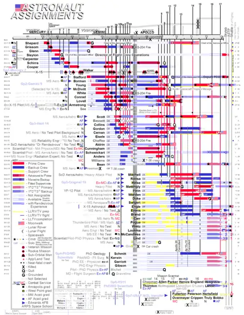 ![]() | Neil Alden Armstrong | ex-USN | Wapakoneta (Ohio) Cincinnati (Ohio) | Gemini 8 () Apollo 11 () | Premier amarrage dans l'espace Premier pas sur la Lune | Armstrong est diplômé de l'université Purdue avec un Bachelor of Science en génie aéronautique en 1955. Il a effectué 78 missions de combat pendant la guerre de Corée en tant qu'aviateur naval, puis est devenu pilote d'essai pour le National Advisory Committee for Aeronautics (NACA, le précurseur de la NASA) au centre de vol à grande vitesse de la base aérienne Edwards où il a piloté l'avion-fusée North American X-15. Il effectue son premier vol spatial en tant que commandant de Gemini 8 en mars 1966, devenant le premier astronaute civil de la NASA à voler dans l'espace. Au cours de cette mission avec le pilote David Scott, il a effectué le premier amarrage de deux engins spatiaux, mais la mission a été interrompue après qu'Armstrong a été contraint d'utiliser une partie de son carburant de contrôle de rentrée pour faire face à un roulis dangereux causé par un propulseur bloqué. Lors de l'entraînement pour son deuxième et dernier vol spatial, en tant que commandant d'Apollo 11, il s'est éjecté du Lunar Landing Research Vehicle quelques instants avant un crash. En juillet 1969, lui et son pilote de module lunaire, Buzz Aldrin, sont devenus les premiers à alunir. Armstrong a été la première personne à marcher sur la surface lunaire et il a passé deux heures et demie à l'extérieur du vaisseau spatial. Il a obtenu un Master of Science en génie aérospatial de l'université de Californie du Sud en 1970. Il a démissionné de la NASA en 1971 et a enseigné le génie aérospatial à l'université de Cincinnati jusqu'en 1979. Il a participé à l'enquête sur l'accident d'Apollo 13 et à la Commission Rogers qui a enquêté sur l'accident de la navette spatiale Challenger. | [36],[39] |