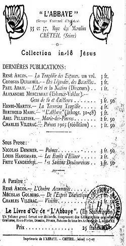 - 1 2 On trouve aussi sur le document d'appel lancé à l'automne 1906 : « L'Abbaye, association fraternelle d'artistes », dans Le Vieux Saint-Maur par Henry Pouvereau, bulletin, Paris, F. Champion, 1929, p. 27.