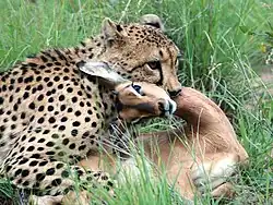 Le guépard est un mammifère carnivore. Il se nourrit d'antilopes de taille moyenne et grande et de petits animaux rapides comme les lièvres du Cap et les rongeurs. Il préfère les impalas, koudous, Puku, oribi, springbok, oryx, steenbok, gnous, phacochère, bubale et autres ongulés. Les espèces de proies préférées du guépard sont l'oryx et le nyala .[réf. nécessaire]