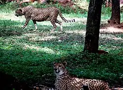 Deux guépards en captivité dans le parc zoologique de Nehru, en Inde. Le guépard asiatique, qui habitait autrefois l'Inde, y est éteint[62].