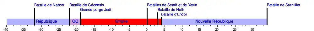 Nouvelle République (Star Wars)Empire galactique (Star Wars)Guerre des clonesRépublique galactiqueBase StarkillerBataille d'EndorBataille de HothBataille de YavinGrande purge JediBataille de GéonosisBataille de Naboo