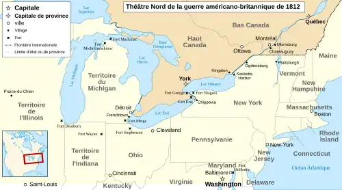 La guerre anglo-américaine de 1812 oppose les États-Unis au Royaume-Uni, avec ses deux colonies du Bas-Canada et du Haut-Canada, entre et . Cette guerre est aussi connue sous les noms de guerre de 1812[4], de seconde guerre d’indépendance[5],[6],[7], ou plus rarement de guerre américano-britannique ou encore de guerre canado-américaine car il s'agit d'une invasion du Canada par les États-Unis. L’appellation « guerre de 1812 » peut parfois conduire à une confusion, l'invasion de la Russie par Napoléon Ier ayant eu lieu la même année.