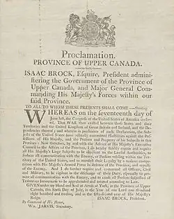 Le , le général de brigade américain William Hull quitta Détroit pour pénétrer au Canada[69], avec une armée composée essentiellement de miliciens. Une fois sur le sol canadien, Hull publia une proclamation ordonnant à tous les sujets britanniques de se rendre, ou « les horreurs et les calamités de la guerre s’abattront sur vous ». Il menaça également de tuer les prisonniers britanniques qui combattaient aux côtés des Indiens. Cette déclaration eut l’effet inverse de celui désiré et contribua à renforcer la résistance face aux attaques américaines.