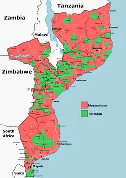 RENAMO réalise ses premières opérations de déstabilisation dans la région de Gorongosa au centre du pays[31],[32]. La RENAMO était composée de plusieurs groupes anticommunistes qui sont apparus juste avant ou peu après l'indépendance du Mozambique[33]. Parmi les membres de la RENAMO se trouvent un certain nombre d'exilés politiques mozambicains opposés par principe au FRELIMO, ainsi que des soutiens originels du gouvernement qui n'ont pas adhéré au tournant marxiste-léniniste que prenait le pays[34].