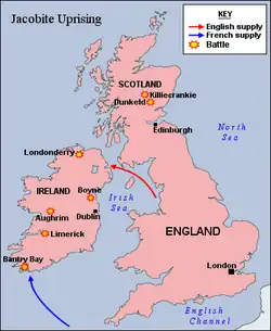 Jacques II avait fui en France où l'attendait Louis XIV. En , soutenu par l'argent, les troupes et les généraux français, il quitte son exil à Saint-Germain pour rallier ses partisans catholiques en Irlande. Le roi de France soutenait Jacques II pour deux raisons : premièrement, Louis XIV croyait fermement dans son droit divin au trône, et deuxièmement il souhaitait éloigner les forces de Guillaume à l'écart des Pays-Bas[48]. L'objectif initial de Jacques II, et de son bras droit le duc de Tyrconnell, était de détruire les places-fortes protestantes du Nord. Cependant, son armée de 40 000 hommes mal équipés ne put pas faire plus qu'assiéger Londonderry. Après une défense acharnée de la ville durant 105 jours, il doit lever son siège à la fin du mois de juillet. Dans le même temps, le premier engagement naval majeur de la guerre a lieu lors de la bataille de la baie de Bantry le , avant la déclaration de guerre anglaise, qui se termine en une petite victoire française : Châteaurenault parvient à livrer du ravitaillement pour la campagne de Jacques II. De leur côté, les forces loyales à Guillaume reçoivent du soutien par le nord et en août, le duc de Schomberg arrive avec 15 000 renforts danois, néerlandais, huguenots et anglais. Après avoir pris Carrickfergus, son avancée est toutefois ralentie devant Dundalk par l'hiver, les maladies et les désertions[49].