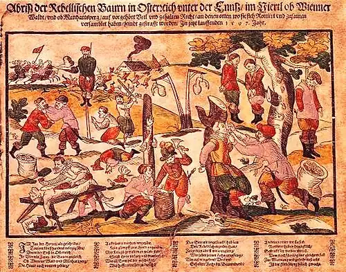 Une révolte paysanne avait déjà éclaté en Basse-Autriche en novembre 1596. Ses causes principales étaient l'augmentation de l'exploitation des paysans par les seigneurs, le poids des impôts, les exactions et surtout l'enrôlement forcé (levée nationale d'un homme sur dix) pour une longue et infructueuse guerre contre les Ottomans[3]. Début février 1597, un régiment de lansquenets sous le commandement du colonel Wenzel Morakschi von Noskau, baron de Lituanie, fut envoyé pour réprimer la révolte. Une cour martiale prononça 54 condamnations à mort, et environ 400 autres accusés furent mutilés et/ou condamnés aux travaux forcés dans les fossés de la forteresse de Vienne, où, pour la plupart, ils succombèrent aux rigueurs de l'hiver. Cet épisode laissa des traces profondes dans les esprits[4].
