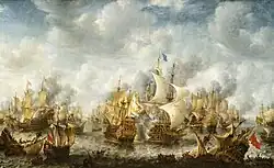 La première des quatre guerres anglo-néerlandaises a lieu de 1652 à 1654. Il s'agit d'une conséquence imprévue de la Première Révolution anglaise qui souhaite contrôler le commerce des colonies britanniques, en particulier par le blocus de la Barbade, pour affaiblir les royalistes qui s'y sont réfugiés et couper leurs liens avec ceux qui sont restés en Angleterre. Dans ce but, le parlement anglais a créé de nouvelles taxes à partir de 1643, comme celle qui prélève 25 % des « rentes annuités et offices »[1] pour financer un énorme effort de guerre, en particulier dans la construction de navires[2]. L'Angleterre fait un énorme effort de modernisation de sa flotte dans les années 1640, construisant pendant les quatre premières années plus de navires que pendant les 25 précédentes. Le Parlement craint en particulier que les royalistes exilés à l'étranger ne contrôlent progressivement toute la flotte marchande par la piraterie. Une loi du créée une taxe de 15 % sur la cargaison de tous les navires marchands, pour financer leur protection sous forme de convois escortés par des navires de guerre.
