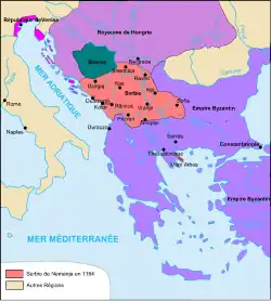 Toutefois cette soumission ne s’appliquait qu’à la personne de Manuel[65] et lorsque celui-ci mourut en 1180, Stefan Nemanja participa à partir de 1183 aux côtés de la Hongrie à une guerre contre l'Empire grec, les deux armées occupant la ville et la région de Niš[66]. Lorsque Bela III (r. 1172-1196) fut renversé par un coup d’État ourdi par Constantinople, Nemanja continua seul la guerre contre Byzance. Ayant comme unique objectif d’unifier sous sa gouverne les terres serbes, il s'empara des régions jouxtant la ville de Vranje, toute la vallée de la Morava, du Kosovo, de Hvosno et Lab (la Métochie d’aujourd’hui). Puis, il décida de reprendre à Byzance les terres de l'ancienne Dioclée qui étaient, pour lui, celles de ses ancêtres. En 1184, il s’attaqua à la ville de Raguse (Dubrovnik) où Constantinople ne disposait plus que d’une suzeraineté nominale, mais sans succès. Enfin, en 1186, Nemanja décida d’annexer les autres villes de la région de Zeta qui étaient encore sous la domination de Michel III Vojislav, prince de Dioclée[67],[68].