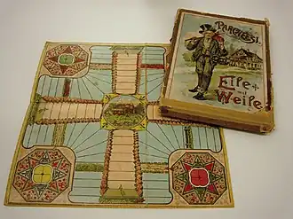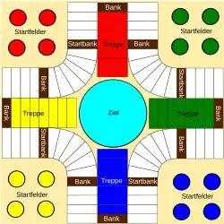Au milieu du plateau se trouve un cercle ou un octogone, dénommé paradis ou but. Le but du jeu est de parvenir à acheminer tous ses pions de la base de départ au paradis en faisant le tour complet du plateau. Autour du paradis se trouvent quatre champs de sept cases de la couleur de chaque camp, les échelles. Le chemin pour y arriver est composé de cases normales et de cases foncées, les « petits bancs ». Aux quatre coins du plateau se trouvent les zones de départ de chaque camp, aussi appelées « maison ».