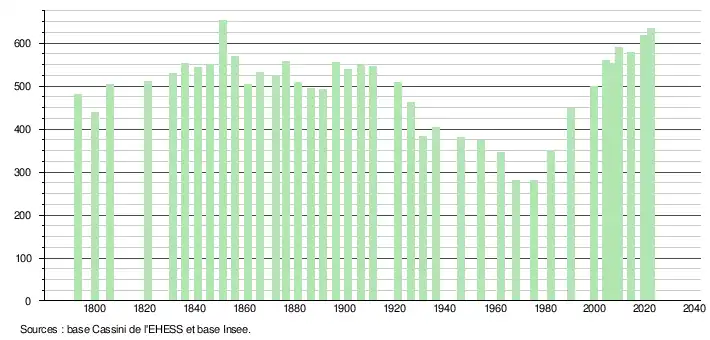 L'évolution du nombre d'habitants est connue à travers les recensements de la population effectués dans la commune depuis 1793. Pour les communes de moins de 10 000 habitants, une enquête de recensement portant sur toute la population est réalisée tous les cinq ans, les populations de référence des années intermédiaires étant quant à elles estimées par interpolation ou extrapolation[21]. Pour la commune, le premier recensement exhaustif entrant dans le cadre du nouveau dispositif a été réalisé en 2004[22].