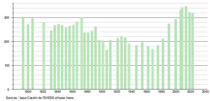 L'évolution du nombre d'habitants est connue à travers les recensements de la population effectués dans la commune depuis 1793. Pour les communes de moins de 10 000 habitants, une enquête de recensement portant sur toute la population est réalisée tous les cinq ans, les populations de référence des années intermédiaires étant quant à elles estimées par interpolation ou extrapolation[19]. Pour la commune, le premier recensement exhaustif entrant dans le cadre du nouveau dispositif a été réalisé en 2008[20].