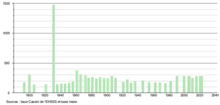 L'évolution du nombre d'habitants est connue à travers les recensements de la population effectués dans la commune depuis 1793. Pour les communes de moins de 10 000 habitants, une enquête de recensement portant sur toute la population est réalisée tous les cinq ans, les populations de référence des années intermédiaires étant quant à elles estimées par interpolation ou extrapolation[25]. Pour la commune, le premier recensement exhaustif entrant dans le cadre du nouveau dispositif a été réalisé en 2005[26].