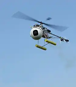 Hélicam est un mini hélicoptère télécommandé utilisé pour obtenir des images aériennes ou des images animées à l'aide de caméras vidéo, fixes ou animées. Le système de montage de la caméra télécommandée permet des mouvements de panoramique, d'inclinaison et de roulis. Un émetteur vidéo embarqué sans fil transmet le signal en direct à l'opérateur de la caméra, les images peuvent être enregistrées à bord, au sol ou les deux. Le système est contrôlé par deux opérateurs aux commandes indépendantes : le pilote de l'hélicoïde et l'opérateur de la caméra[1].