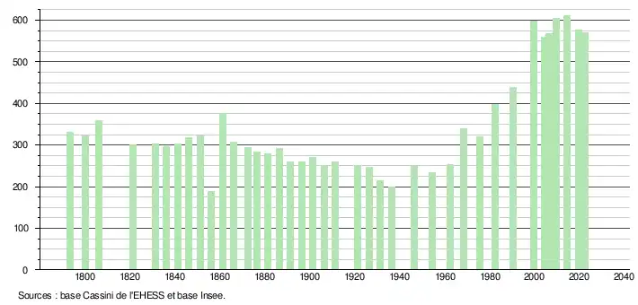 L'évolution du nombre d'habitants est connue à travers les recensements de la population effectués dans la commune depuis 1793. Pour les communes de moins de 10 000 habitants, une enquête de recensement portant sur toute la population est réalisée tous les cinq ans, les populations de référence des années intermédiaires étant quant à elles estimées par interpolation ou extrapolation[25]. Pour la commune, le premier recensement exhaustif entrant dans le cadre du nouveau dispositif a été réalisé en 2004[26].