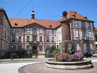 Après différents projets, jugés trop coûteux, des architectes Pflug et Joseph Massol, c'est le sous-greffier de la ville Georges-Joseph Barth qui dessina les plans de l’édifice actuel. La construction a commencé en 1757 fut rapidement achevée. L'édifice comporte des ailes en fer à cheval autour de la cour ouverte sur la place et des ailes en quadrilatère autour d'une cour intérieure. Les façades sont très soignées, ornées de sculpture figurées (visage, corps, ...) et de rocailles (arbres, branche, ...) sur les consoles des balcons et sur les linteaux de certaines baies[2].