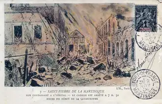 La terrible nuée ardente émise au matin du 8 mai 1902 par la montagne Pelée laisse l'hôpital à l'état de ruines. Les aiguilles de l'horloge du fronton de la façade restent figées sur l'heure de la catastrophe à 7h52.