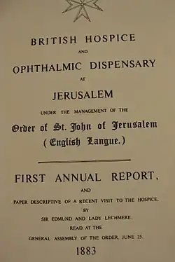 Le premier hôpital du Très vénérable ordre de Saint-Jean ouvre en 1882 sur la route de Bethléem, au sud de la vieille ville de Jérusalem. La reine Victoria le reconnaît officiellement et lui accorde une charte royale. Sir Edmund Lechmere, un des fondateurs du Très vénérable ordre de Saint-Jean est l'une des figure clefs de sa création[1].