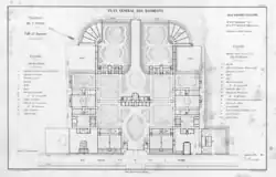 Bâti à proximité du centre ville[2] sur un terrain de 14 ha clos de murs[3], l'établissement présente un axe de symétrie est-ouest avec en son centre le bâtiment administratif donnant sur un parc et, de chaque côté, 5 pavillons sur deux niveaux construits symétriquement, ceux des hommes côté sud et ceux des femmes à l'opposé. Les bâtiments sont tous reliés par des galeries couvertes[4]. Le restant du terrain, entre les bâtiments et la clôture externe, est occupé par les jardins potagers destinés à nourrir les malades et le plus vieux vignoble attesté de France, le clos de la Chaînette[5].