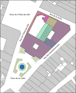 En 1909, Albert Ballu reprend le projet de Lisch d'extension de l'hôtel de ville sur la place de la Caille[18], mais faute de moyens la municipalité y renonce et achète peu à peu les maisons de l'îlot. Après de multiples travaux, certains services furent implantés dans les étages de ces bâtiments. Aujourd'hui, les services de la ville se sont étendus dans les étages des bâtiments et ne communiquent que par un dédale de couloirs et d'escaliers[19].