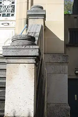 Deux tuyaux de gouttières longent l'avance centrale, se finissant en modestes gargouilles. Latéralement, quatre ancres en forme de T sont disposées au niveau du premier étage ; deux paires se répondant symétriquement au niveau de l'avance et au niveau du mur latéral[39].