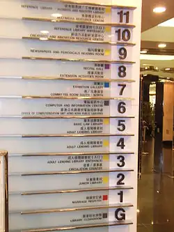 - la bibliothèque publique de l'hôtel de ville, un établissement de huit étages, qui servait autrefois de bibliothèque centrale de Hong Kong (du 9e au 11e étages)