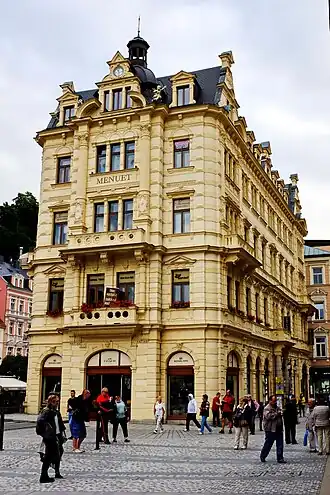 L'ancien hôtel de ville de Karlovy Vary sur la place du marché fut démoli en 1875, remplacé ensuite par la nouvelle Stadthaus, construite de 1892 à 1893 en style néo-Renaissance nordique[2]. L'édifice a servi jusqu'à la Seconde Guerre mondiale[3].