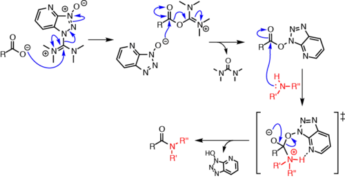 Le HATU ou hexafluorophosphate de (diméthylamino)-N,N-diméthyl(3H-[1,2,3]triazolo[4,5-b]pyridin-3-yloxy)méthaniminium est un réactif utilisé en synthèse peptidique afin de créer un ester activé à partir d'un acide carboxylique. Il est utilisé avec la base de Hünig (N,N-diisopropyléthylamine, DIPEA) pour former des liaisons amide. Généralement le DMF est utilisé comme solvant, même si d'autres solvants organiques polaires peuvent être utilisés.