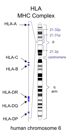 En génétique, HLA désigne plutôt le groupe de gènes correspondant, on parle du système HLA (situé sur le bras court du chromosome 6).