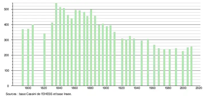 - ↑ Dans le tableau des recensements et le graphique, par convention dans Wikipédia, le principe a été retenu, pour les populations légales postérieures à 1999 de n’afficher dans le tableau des recensements et le graphique que les populations correspondant à l'année 2006, première population légale publiée calculée conformément aux concepts définis dans le décret no 2003-485 du 5 juin 2003, et les années correspondant à une enquête exhaustive de recensement pour les communes de moins de 10 000 habitants, ainsi que la dernière population légale publiée par l’Insee.