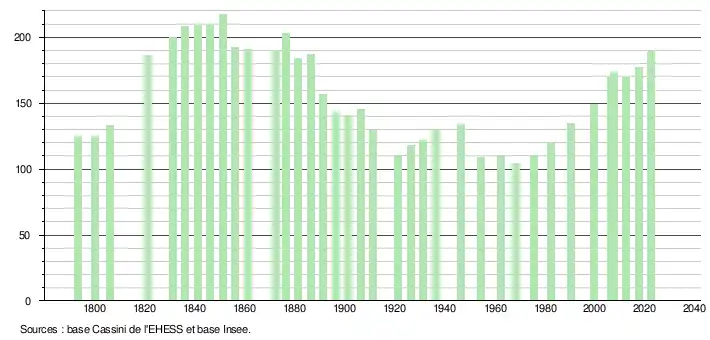 L'évolution du nombre d'habitants est connue à travers les recensements de la population effectués dans la commune depuis 1793. Pour les communes de moins de 10 000 habitants, une enquête de recensement portant sur toute la population est réalisée tous les cinq ans, les populations de référence des années intermédiaires étant quant à elles estimées par interpolation ou extrapolation[18]. Pour la commune, le premier recensement exhaustif entrant dans le cadre du nouveau dispositif a été réalisé en 2007[19].