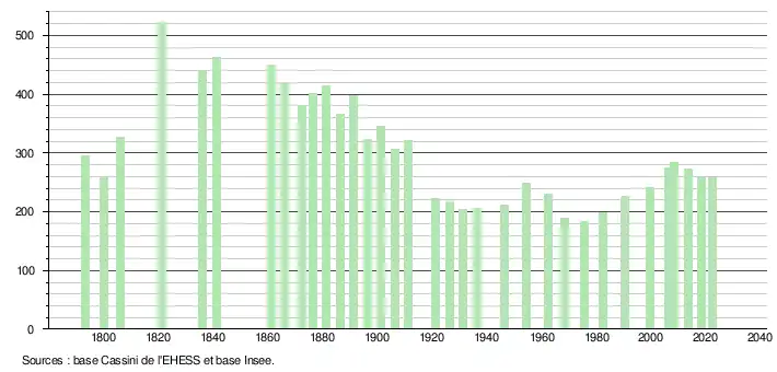 L'évolution du nombre d'habitants est connue à travers les recensements de la population effectués dans la commune depuis 1793. Pour les communes de moins de 10 000 habitants, une enquête de recensement portant sur toute la population est réalisée tous les cinq ans, les populations de référence des années intermédiaires étant quant à elles estimées par interpolation ou extrapolation[22]. Pour la commune, le premier recensement exhaustif entrant dans le cadre du nouveau dispositif a été réalisé en 2008[23].