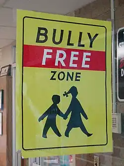 Initiative contre le harcèlement scolaire. La lutte contre les harceleurs passe par des actions publiques comme cet affichage ou des patrouilles de surveillance anti-harcèlement organisées par les écoliers[19].