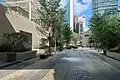 - Rodney Street relie le United Center (à gauche) et Harcourt Garden (à droite). La rue au premier plan est Queensway (en) (2010).