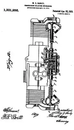Système de décompresseur  breveté W. S. Harley. À noter les bouchons à vis dans les culasses donnant accès aux soupapes.