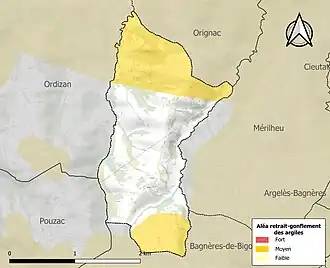 Le retrait-gonflement des sols argileux est susceptible d'engendrer des dommages importants aux bâtiments en cas d’alternance de périodes de sécheresse et de pluie. 39 % de la superficie communale est en aléa moyen ou fort (44,5 % au niveau départemental et 48,5 % au niveau national). Sur les 55 bâtiments dénombrés sur la commune en 2019, 17 sont en aléa moyen ou fort, soit 31 %, à comparer aux 75 % au niveau départemental et 54 % au niveau national. Une cartographie de l'exposition du territoire national au retrait gonflement des sols argileux est disponible sur le site du BRGM[20],[Carte 3].
