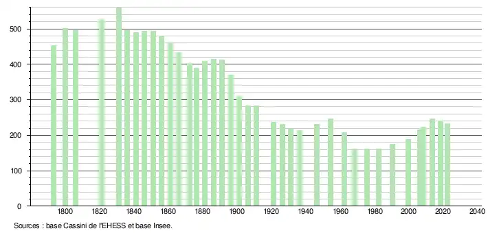 L'évolution du nombre d'habitants est connue à travers les recensements de la population effectués dans la commune depuis 1793. Pour les communes de moins de 10 000 habitants, une enquête de recensement portant sur toute la population est réalisée tous les cinq ans, les populations de référence des années intermédiaires étant quant à elles estimées par interpolation ou extrapolation[31]. Pour la commune, le premier recensement exhaustif entrant dans le cadre du nouveau dispositif a été réalisé en 2008[32].