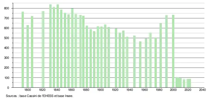 L'évolution du nombre d'habitants est connue à travers les recensements de la population effectués dans la commune depuis 1793. Pour les communes de moins de 10 000 habitants, une enquête de recensement portant sur toute la population est réalisée tous les cinq ans, les populations de référence des années intermédiaires étant quant à elles estimées par interpolation ou extrapolation[50]. Pour la commune, le premier recensement exhaustif entrant dans le cadre du nouveau dispositif a été réalisé en 2004[51].
