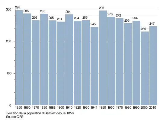 La population d'Henniez est de 298 habitants en 1850. Elle baisse à 245 habitants en 1941, puis augmente à 296 habitants en 1950. Elle baisse légèrement depuis jusqu'à 230 habitants en 2000. Le graphique suivant résume l'évolution de la population d'Henniez entre 1850 et 2010[13] :