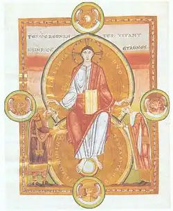 Le roi Henri III tenant le sceptre et l'orbe – miniature vers 1040 dans l'abbaye d'Echternach. | |