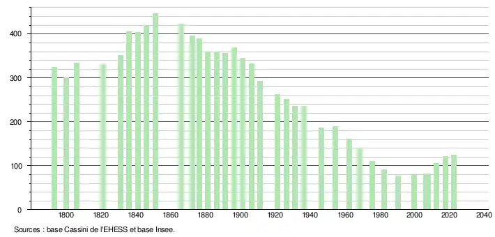 L'évolution du nombre d'habitants est connue à travers les recensements de la population effectués dans la commune depuis 1793. Pour les communes de moins de 10 000 habitants, une enquête de recensement portant sur toute la population est réalisée tous les cinq ans, les populations de référence des années intermédiaires étant quant à elles estimées par interpolation ou extrapolation[19]. Pour la commune, le premier recensement exhaustif entrant dans le cadre du nouveau dispositif a été réalisé en 2007[20].
