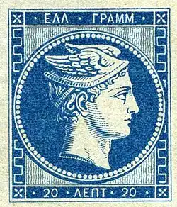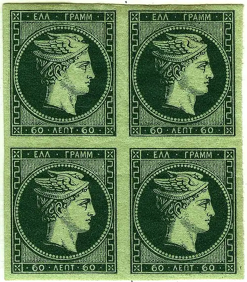 Le premier type de timbres de Grèce est dénommé « grosse tête d'Hermès » pour le différencier du type suivant, émis en 1886 et dit de la « petite tête d'Hermès »[15].