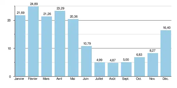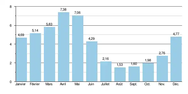 La rivière présente des fluctuations saisonnières de débit typiques d'un régime nivo-pluvial. En moyenne (moyenne effectuée sur la période 1962-2008), les hautes eaux se déroulent en hiver et surtout au printemps et poussent le débit mensuel moyen à des niveaux situés entre 4,68 et 7,38 m3/s de décembre à mai inclus (maximum en avril-mai). Ces hautes eaux sont liées aux pluies d'hiver et de printemps, auxquelles se rajoute la fonte des neiges entre mars et mai. C'est d'ailleurs la fonte des neiges qui détermine la position du maximum en avril et mai. Dès le mois de juin, par suite de l'épuisement du stock neigeux et de la hausse de la température, donc de l'évaporation, le débit diminue rapidement (4,29 m3/s en juin) pour aboutir à la période des basses eaux. Celles-ci ont lieu en été et en automne, de début juillet à fin octobre, avec une baisse du débit moyen mensuel allant jusqu'à 1,53 m3/s au mois d'août, ce qui représente encore 37 % du module et reste donc très consistant.