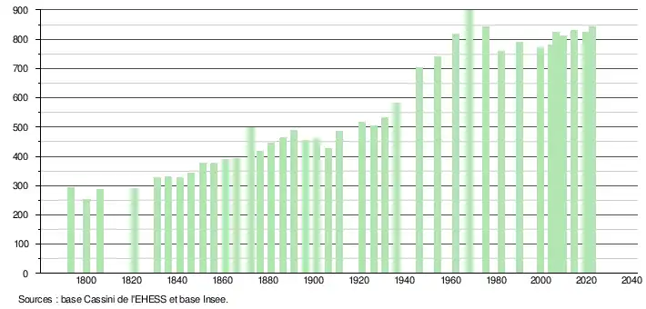 L'évolution du nombre d'habitants est connue à travers les recensements de la population effectués dans la commune depuis 1793. Pour les communes de moins de 10 000 habitants, une enquête de recensement portant sur toute la population est réalisée tous les cinq ans, les populations de référence des années intermédiaires étant quant à elles estimées par interpolation ou extrapolation[28]. Pour la commune, le premier recensement exhaustif entrant dans le cadre du nouveau dispositif a été réalisé en 2004[29].