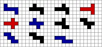 • 5 hexaminos, en bleu, ont une symétrie selon un point, aussi connu comme une symétrie de rotation d'ordre 2. Leur groupe de symétrie possède deux éléments : l'identité et la rotation de 180°.