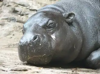 L'hippopotame pygmée (Choeropsis liberiensis[1] ou Hexaprotodon liberiensis) appelé aussi Hippopotame nain ou encore Hippopotame nain africain, est une espèce d'hippopotames originaire des forêts et des marécages de l'Afrique de l'Ouest. Ce mammifère est un animal discret, solitaire et nocturne même si la masse d'un mâle adulte peut avoisiner 275 kg. Il est une des deux seules espèces encore existantes dans la famille des Hippopotamidae, l'autre étant son cousin beaucoup plus imposant, l'hippopotame commun, dit amphibie.