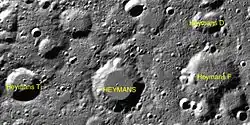 Les cratères dit satellites sont de petits cratères situés à proximité du cratère principal, ils sont nommés du même nom mais accompagnés d'une lettre majuscule complémentaire (même si la formation de ces cratères est indépendante de la formation du cratère principal). Par convention ces caractéristiques sont indiquées sur les cartes lunaires en plaçant la lettre sur le point le plus proche du cratère principal. Liste des cratères satellites de Heymans :