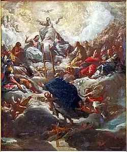 - « Autour du trône je vis vingt-quatre trônes, et sur ces trônes vingt-quatre vieillards assis, revêtus de vêtements blancs, et sur leurs têtes des couronnes d’or. [...] les vingt-quatre vieillards se prosternent devant celui qui est assis sur le trône, ils adorent celui qui vit aux siècles des siècles, et ils jettent leurs couronnes devant le trône, en disant : Tu es digne, notre Seigneur et notre Dieu, de recevoir la gloire, l’honneur et la puissance ; car tu as créé toutes choses, et c’est par ta volonté qu’elles existent et qu’elles ont été créées. »[28]