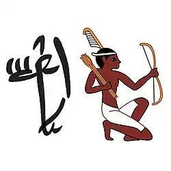 Il représente un homme en tenue de soldat archer, accroupi en génuflexion mais pied gauche sur sa pointe, bras droit tendu tenant un arc et bras gauche replié en retrait tenant une flèche, plusieurs flèches ou un carquois. Il est translittéré mšˁ.
