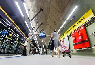 C'est une station souterraine, située à 25 mètres sous le niveau du sol, avec deux quais latéraux, sa structure en béton est apparente. Deux passerelles de distribution en structure métallique fixées avec des tirants sont situées à chaque extrémité des quais. La station est prévue pour absorber trente mille voyageurs par heure aux heures de pointe[1]. Elle dispose de 26 escaliers mécaniques et 13 escaliers fixes[5].